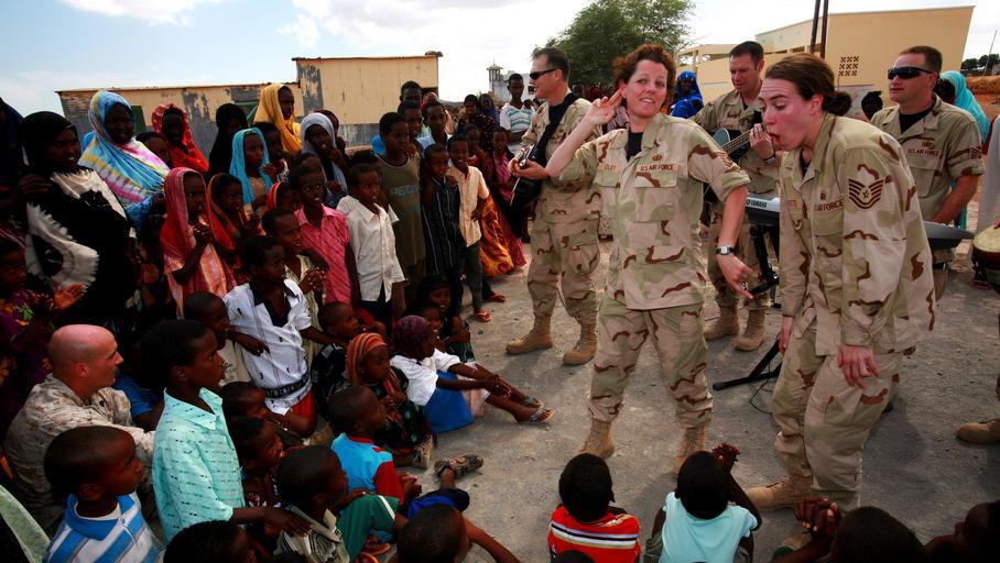 | Keywords: Live Round Performs for Locals and CJTF-HOA Personnel in Djibouti DVIDS75725.jpg en Villagers listen to a performance by the U S Central Command Air Forces Band Live Round in Chebellier Djibouti Jan 23 Based out of the Air Force Academy in Colorado Springs Colo and Scott Air Force Base in Illinois the nine-piece bands' sets included an eclectic mix of music from the synthetic guitar riffs of The Police to the funky beats of Justin Timberlake and Christina Aguilera U S Marine Corps Photo/Sgt Alec Kleinsmith 2008-01-23 https //www dvidshub net/image/75725 75725 2008-02-03 06 55 CHABELLEI YAR DJ PD-USGov Scott Air Force Base Images from DoD uploaded by Fæ |