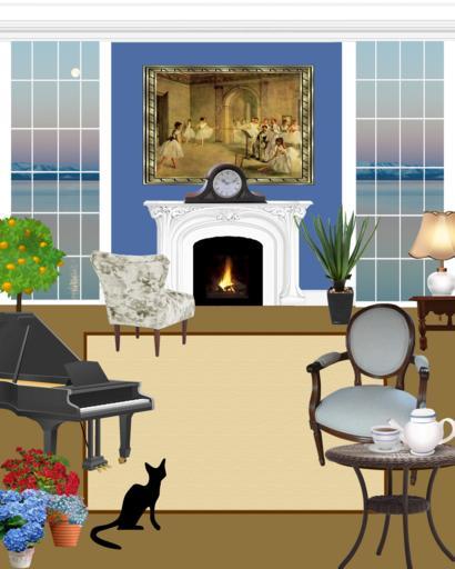 Keywords: living room living black cat fireplace armchair outbreak flower pot glazed doors plants window patio doors degas piano lamp chairs reproduction table