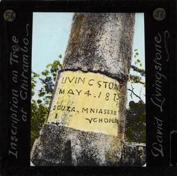 | Keywords: Livingstone Memorial at Chitambo, Africa, ca.1873-ca.1900 (imp-cswc-GB-237-CSWC47-LS16-056).jpg en <br> Livingstone Memorial at Chitambo Africa ca 1873-ca 1900 Photograph of an inscription on a tree at Chitambo near to the spot where David Livingstone died in 1873 Livingstone's heart was buried here under a Mvula tree later the site of the Livingstone Memorial His body was carried by his loyal attendants Chuma and Susi over a thousand miles to the coast and was returned to Britain for burial ; This belongs to a series of Church of Scotland Foreign Missions Committee lantern slides relating to David Livingstone 1813-1873 the Scottish missionary who was best known as an explorer of Africa and anti-slavery campaigner Livingstone was born in Blantyre Scotland and after working in the local cotton mill from the age of 10 he went on to study medicine and theology in Glasgow in 1836 Having decided to become a missionary he was posted to southern Africa in 1841 In 1845 he married Mary Moffat During his life Livingstone carried out exploration of southern eastern and central Africa he discovered and named the Victoria Falls and it was his meeting with H M Stanley during a search for the source of the Nile that gave rise to the popular quotation Dr Livingstone I presume David Livingstone died in Africa on 1 May 1873 and his body was buried in Westminster Abbey Photographer Unknown Subject personal name Livingstone David 1813-1873 Filename imp-cswc-GB-237-CSWC47-LS16-056 tif Coverage date after 1873 Part of collection International Mission Photography Archive ca 1860-ca 1960 Type images Part of subcollection Photographs from the Centre for the Study of World Christianity University of Edinburgh U K ca 1900-ca 1940s Repository name Centre for the Study of World Christianity Archival file impaunpub_Volume7/1889 url Repository address The University of Edinburgh School of Divinity New College Mound Place Edinburgh EH1 2LX United Kingdom Geographic subject country Zambia Format aacr2 1 lantern slide 8 x 8 cm Geographic subject continent Africa Rights Contact the repository for details Part of series David Livingstone LS16 Repository email divinity-CSWC ed ac uk Subject lcsh Keyword Memorials; Missionaries Date created circa 1875/1940 Publisher of the digital version University of Southern California Libraries Subject aat genre close up views Format aat lantern slides Legacy record ID impa-m69472 Access conditions http //www ed ac uk/schools-departments/divinity/research/centres/world-christianity/collections-resources File GB 237 CSWC47/LS16/56 circa 1875 /1940 author http //digitallibrary usc edu/cdm/ref/collection/p15799coll123/id/65005 PD-old-70-1923 Magic lantern images Images from USC Digital Library uploaded by Fæ International Mission Photography Archive ca 1860-ca 1960 David Livingstone IMPA |