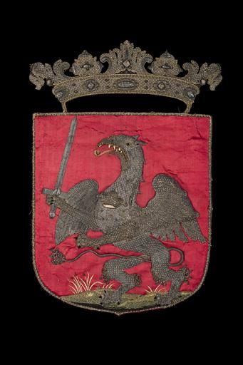 | Keywords: Livlands vapen med grip, 1660 - Livrustkammaren - 108736.tif LSH artwork sv Vapensköld av röd sidenatlas kantad av en bård av en snodd av smala silverlan och gul silkestråd virad runtom en silkeskärna samt en tvinnad silvertråd runtom silkeskärna ytterst kantat av ett smalt vävt band av silverlan och gul silkestråd samt av silvertråd utdragen i öglor <br/>Mitt på vapnet sitter ett applikationsbroderi i relief föreställande en stående grip i höger tass hållandes en värja Broderiet är huvudsakligen utfört i läggsöm av silvertråd nedsydd med stygn av vit silkestråd Gripen har breda utspärrade vingar med fjädrar av flikar markerade med snören av tvinnad silvertråd och vit silkestråd Gapet kantas av en snodd av gul silkestråd och silvertråd samt en tvinnad förgylld tråd Gapets insida samt gripens långa utsträckta tunga är broderat med röd silkestråd Tänderna är spetsiga av vitt skinn Ögat är av silverlan med en svart glaspärla som pupill Ögat ramas in av kantilj av silvertråd och ögonbryn har markerats med beigefärgade stygn av silkestråd Nosborren har markerats med en kantilj av silvertråd ifylld med svart silkestråd Gripen har två små spetsiga öron på bakre delen av huvudet med kontur av svart silkestråd samt ifyllda med svart silkestråd Bak på nacken sticker ut fyra fjädrar markerade med svart silkestråd Gripen håller i höger tass i en lång värja med skaft av silvertråd och silverlan och med klinga av silvertråd Gripens klor är av svart silkestråd Svansen förd mellan benen är av en snodd av silvertråd runtom en silkeskärna Svanstipp och benskägg är av krusad silvertråd runtom silkeskärna <br/>Gripen står på en gräsbeklädd kulle av silkestråd i gröna och gula nyanser samt svart silkestråd underst och med små uppstickande grässtrån av gulvit silkestråd varav några strån har knoppar av brun silkestråd <br/>Mitt på gripen vid bringan broderat en krona av förgylld tråd och förgyllda lan samt med en öppning av blekt gulvit silkestråd Under kronan står broderat med silvertråd C R S <br/>Vapnet kröns av en öppen krona med fem spetsar föreställande stiliserade blommor och blad Spetsarna är broderade av förgylld tråd i läggsöm med upphöjda kanter av silvertråd på silkeskärna Mitt på vardera blomma och blad är broderat en romb eller en oval av silverlan omvirade av blå respektive röd silkestråd kantade av tvinnade förgyllda lan och små prickar av kantiljer av förgylld tråd På den mittersta spetsen är broderat en rad av fem små prickar av kantiljer av silvertråd och på de två yttersta spetsarna är broderat sju små prickar Mellan spetsarna är ifyllt med svart silkestråd Kronringen är 40 mm bred kantad av en snodd av silverlan och gul silkestråd runtom en silkeskärna samt av ett smalt vävt band av vit silkestråd och silvertråd utdragen i små öglor På kronringen är broderat fem blommor av silvertråd med silverlan i mitten omvirade av blå respektive röd silkestråd kantade av virade förgyllda lan samt små prickar av kantiljer av silvertråd <br/>Vapnet är fodrat med beigefärgad linnelärft på baksidan klätt med pålimmat grågul makulatur Mitt på skölden en påskrift med svart bläck Lifflant original caption Livlands vapen med grip 1660 <br/> Nyckelord Föremålsbild Grip Landskapsvapen 1660-tal Fantasidjur Karl X Gustavs död och begravning 1660 glass pearl Färg svart dekor material glaspärla - silk Färg svart grön gul vit röd blå dekor material silkestråd - silver Färg silver guld dekor material silvertråd - hide Färg vit dekor material skinn - paper Färg gul foder material papper - silk Färg röd material sidenatlas - linen Färg beige foder material linnelärft - silver Färg silver guld material silverlan size mm 423 sköld size mm 375 sköld size mm 110 krona size mm 402 krona g 350 LRK 1648 - Westfaliska freden 1998-1999 Dödens teater 2015-2016 Livrustkammaren place of origin original filename lm_dig13346 60435 inventory number LRK 24861 108736 CC-BY-SA Jens Mohr Fictional animals Griffins in heraldry Coats of arms of counties of Sweden 1660s works Funeral of Charles X Gustav of Sweden Coats of arms to be classified Jens Mohr Media contributed by LSH dim-with multiple size templates Media contributed by LSH 2016-05 |