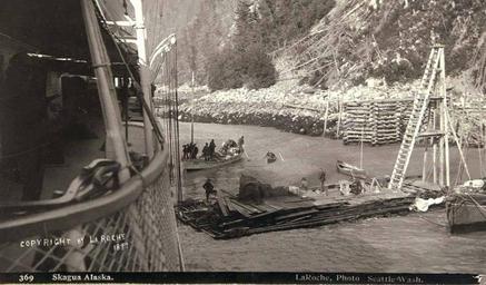 | Keywords: Loading supplies on to steamer in Skagway harbor, Alaska, 1897 (LAROCHE 140).jpeg check categories 9 June 2016 3 Photograph Creator Frank La Roche Caption on image Skagua Alaska We are going to be in it any way the cat jumps This expression was made use of by a prominent man in Skaguay and it practically conveys the intention of the townsmen in general Not only are they discussing the best means of competing for the patronage of the miners on the overland trip but they are rapidly developing all kinds of conveniences The small boat in the picture is occupied in ferrying goods to the steamer which is at anchor waiting for high tide before proceeding on its journey The raft beside the steamer is an odd looking structure but its usefulness can be readily appreciated by those who have had any experience in this neighborhood Frank La Roche En Route to the Klondike 1898 Klondike Gold Rush Subjects LCTGM Boats--Alaska--Skagway; Rafts--Alaska--Skagway Subjects LCSH Skagway Alaska depicted place Skagway Alaska 1897 Institution University of Washington UWASH-LAROCHE-source accession number laroche 140 PD-old-auto-1923 1936 Information field Order Number LAR272 Images from the Frank La Roche Photographs Collection to check Boats in Alaska Rafts in the United States Skagway Alaska |
