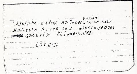 | Keywords: Lochielletter.jpg en Letter describing the location of the body of Anthony John Jones Own Nfren 1988-08-01 Free content Wrong license Check categories 2009 June 27 en wikipedia Tony_Jones_ missing _presumed_murdered Australia Western Australia Perth Western Australia 5 Murder People of Australia Perth Western Australia Anthony John Jones |