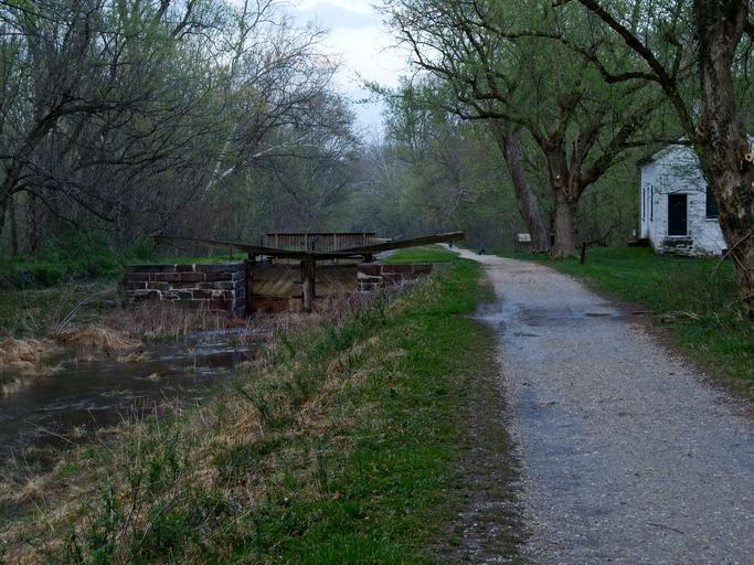 Keywords: Lock 11 C and O Canal.jpg en Lock 11 on the C and O canal at the 9 mile mark mileposts can be seen in pic Part of 7 Locks own Bonnachoven Chesapeake Ohio Canal National Historical Park Locks water transport Cc-zero