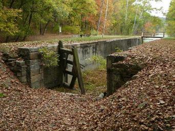 | Keywords: Lock 58 C and O From NPS.jpg en Lock 58 on the Cheasapeake and Ohio Canal The NPS site says Lock 58 is the first of the 13 composite locks These locks differ from the other locks on the canal Between the upper end of the lower gate pockets to the lower end of the upper gate pockets the stone walls ere moved 9 ¼° on each side resulting in a clear dimension between lock walls of 16 ™-16 ½ rather that the 15 ™ previously adhered to The normal clear dimension was resumed both up and down from these points The walls were of rough-cut and rough-coursed limestone principally dry-laid were the walls were widened and mortared in the other areas The wider area was filled in with 5 ¼ square timbers This wooden section of the lock was water-proofed at first by being kyanized and later with creosote The wood timbers required frequent replacing and around 1900 many repairs were made by stripping out the wood and pouring a cement liner with the more typical 15 ™ between lock walls The wood at Lock 58 was replaced as described and the date 1909 is impressed on one of the walls Stone walls are exposed on only the extension and wingwalls National Park Service http //www hscl cr nps gov/insidenps/report asp STATE PARK CHOH STRUCTURE SORT RECORDNO 911 National Park Service Dept of Interior US Government Chesapeake Ohio Canal National Historical Park Locks water transport PD-USGov |