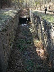 NPS site states Lock 63-531 Sic; is the 6th of the 13 composite locks and had a 10 lift These locks differ from the other locks on the canal Between the upper end of the lower gate pockets to the lower end of the upper gate pockets the stone walls were moved 9 ΒΌΒ° on each side resulting in a clear dimension between lock walls of 16 -16 Β½ rather that the 15 previously adhered to The normal clear dimension was resumed both up and down from these points The walls were of rough-cut and rough-coursed limestone principally dry-laid where the walls were widened and mortared in the other areas The wider area was filled in with 5 ΒΌ square timbers This wooden section of the lock was water-proofed at first by being kyanized and later with creosote The wood timbers required frequent replacing and around 1900 many repairs were made by stripping out the wood and pouring a cement liner This was the case at Lock 63-531; primarily in the lock pockets The coping of the lower extension and wingwalls were also replaced with concrete and there is quite a bit of patching in concrete in various places in the lock None of the wood sheathing remains but some of the protruding bolts that held the wood to the stone are still extant There is a pile of worked stones opposite the upper end of the lock across the towpath which may be stones removed from the lock and replaced with concrete National Park Service http //www hscl cr nps gov/insidenps/report asp STATE PARK CHOH STRUCTURE SORT RECORDNO 961 National Park Service Dept of Interior US Government Chesapeake Ohio Canal National Historical Park Locks water transport PD-USGov |
