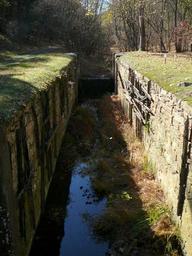 NPS site says Lock 64-532 Sic; is the 6th of the 13 composite locks and had a 10 lift These locks differ from the other locks on the canal Between the upper end of the lower gate pockets to the lower end of the upper gate pockets the stone walls were moved 9 ΒΌΒ° on each side resulting in a clear dimension between lock walls of 16 -16 Β½ rather that the 15 previously adhered to The normal clear dimension was resumed both up and down from these points The walls were of rough-cut and rough-coursed limestone principally dry-laid where the walls were widened and mortared in the other areas The wider area was filled in with 5 ΒΌ square timbers This wooden section of the lock was water-proofed at first by being kyanized and later with creosote The wood timbers required frequent replacing and around 1900 many repairs were made by stripping out the wood and pouring a cement liner At Lock 64-532; concrete has replaced the wood lining in both the upper and lower lock pockets The original stone coping of the corners of the gate pockets was retained but the wood coping for the approximate 10 length of the pockets was also replaced by concrete The wood coping for the run of the lock and above the pockets was also retained but is now gone The lower berm wingwall is buttressed with a 4Β½ wide stone wall that is stepped down in its 25 length parallel to the run of the lock This buttress helped to keep the turbulence created by the bypass flume discharge separate from the water at the lock entrance Some of the wooden sheathing remains along the mid-lock walls and many of the bolts National Park Service http //www hscl cr nps gov/insidenps/report asp STATE PARK CHOH STRUCTURE SORT RECORDNO 963 National Park Service Dept of Interior US Government Chesapeake Ohio Canal National Historical Park Locks water transport PD-USGov |