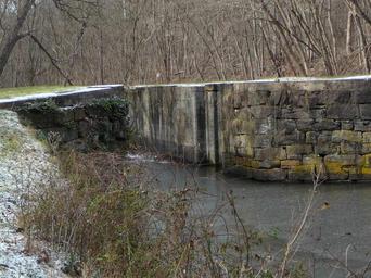 | Keywords: Lock 67 Darbeys Lock from NPS.jpg en Lock 67 NPS site says Lock 67 is the 9th Composite Lock These locks differ from the other locks on the canal Between the upper end of the lower gate pockets to the lower end of the upper gate pockets the stone walls were moved 9 ¼ ™ on each side resulting in a clear dimension between lock walls of 16 ™-16 ½ rather that the 15 ™ previously adhered to The normal clear dimension was resumed both up and down from these points The walls were of rough-cut and rough-coursed limestone principally dry-laid where the walls were widened and mortared in the other areas The wider area was filled in with 5 ¼ square timbers This wooden section of the lock was water-proofed at first by being kyanized and later with creosote The wood timbers required frequent replacing and around 1900 many repairs were made by stripping out the wood and pouring a cement liner In the early 1900's that all the wood was removed and a new 9 ¼ ' concrete wall was poured on each side to bring the lock to the standard 15' clear dimension for its interior This pour included the lower lock gate pockets plus a thin concrete plaster coat for the upper lock gate pockets The upper pockets were not originally wood lined and the thin concrete coating has mostly peeled off exposing the original stone pocket As was standard only the corners of the lower ends of both the lock pockets were coped in stone; all other original coping was wood and was replaced by the concrete Both upper extension walls are about 5' long turning at 90° into short wingwalls The lower extension walls run about 13' then splay out at about 60° for a 14' run The berm wall turns again to run perpendicular to the lock for about 23' to a 10 ½ ' wide opening f or the by-pass flume lower exit The towpath approach to the lower end of the lock i s dry-walled for about 100' National Park Service http //www hscl cr nps gov/insidenps/report asp STATE PARK CHOH STRUCTURE SORT RECORDNO 1005 National Park Service Dept of Interior US Government Chesapeake Ohio Canal National Historical Park Locks water transport PD-USGov |
