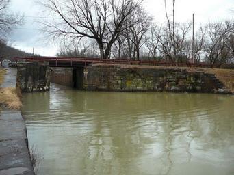 | Keywords: Lock 70 on C and O Canal from NPS.jpg en Lock 70 NPS site says Lock 69 Sic Should be 70 is the 12th of the 13 composite locks These locks differ from the other locks on the canal Between the upper end of the lower gate pockets to the lower end of the upper gate pockets the stone walls were moved 9 ¼ on each side resulting in a clear dimension between lock walls of 16 ™-16 ½ rather that the 15 ™ previously adhered to The normal clear dimension was resumed both up and down from these points The walls were of rough-cut and rough-coursed limestone principally dry-laid where the walls were widened and mortared in the other areas The wider area was filled in with 5 ¼ square timbers This wooden section of the lock was water-proofed at first by being kyanized and later with creosote Lock 70 is one third of a mile below Lock 71 and one fourth of a while above Lock 69 The lock is watered between Lock 70 and 71 The Canal Company took advantage of an exisiting creek Mill Run to locate this lock and the canal bed above the lock The upper end of the lock is dammed with concrete and the lock below carries water to within a foot and a half of normal canal operating level In the early 1900s the wood lining was replaced with concrete Both lower extension wingwalls are also covered with a thin layer of concrete The original wood coping was also replaced with concrete except below the lower gate pockets which is stone probably a re-use of cut stones from another location The remains of the upper lock gates remain in a closed position and much of the gate hardware both upper and lower appears to have been replaced at the time of the installation of concrete The remains of a stone filled wood cribbage is seen above the upper berm wingwall used to separate the flow of water to the lock and the bypass flume The pedestrian bridge across the lock has been replaced several times the current wooden bridge is a recent replacement National park Service http //www hscl cr nps gov/insidenps/report asp STATE PARK CHOH STRUCTURE SORT RECORDNO 1039 National Park Service Dept of Interior US Government Chesapeake Ohio Canal National Historical Park Locks water transport PD-USGov |