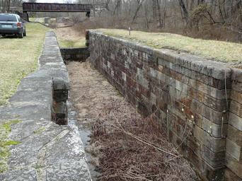 | Keywords: Lock 73 on C and O from NPS.jpg en Lock 73 Note Lock 74 can be seen in the distance Nps site says This lock was built to 1836 specifications It is a cut limestone lift lock similar to Locks 74 and 75 About mid way in the 4' long upper extension walls is a 3 wide 2½ deep drop plank gate slot that terminates 3' down from the coping on the towpath side At a similar height the berm side widens to 10 to continue up through the coping This was probably to aid getting the heavy 15' drop planks in position to slide down The upper wingwalls angle out at about 60 degrees above the end of the extension wall and continue for about 14' The berm only turns again to run back for 6' parallel to the lock and become part of the bypass flume The lower extension walls run for about 14' turn at about 60' to run for another 14' The berm wing only turns again to run perpendicular to the lock; it becomes the wall that is notched to provide an exit for the bypass flume Both sides of the canal approaching the lock have dry laid stone walls 45' long for the berm and 100' for the towpath A 20' long pile of stones between the lower entrance to the lock and the bypass flume exit indicate a former rock filled wood cribbage that divided the turbulent water caused by the bypass flume spill from the quieter water that the barges needed to enter the lock There is some post-1900 patching of concrete around the upper gate pockets The lock is not watered all the wood has been removed as were the iron pins at cap stones National Park Service http //www hscl cr nps gov/insidenps/report asp STATE PARK CHOH STRUCTURE SORT RECORDNO 1088 National Park Service Dept of Interior US Government Chesapeake Ohio Canal National Historical Park Locks water transport PD-USGov |