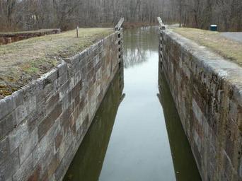 | Keywords: Lock 75 C and O Canal From NPS.jpg en Lock 75 last lift lock on C and O Canal NPS site says; This is a standard cut stone lift lock of gray limestone with a bypass flume on the berm side The lock was built to 1836 specifications and is typical to that standard It is 700' above Lock 74 and is the last of the numbered lift locks on the canal There are equally space bolts protruding above the coping that indicate that a continuous 6 wood coping had been added to deepen the canal but no timber remains The 4' long upper extension wall is grooved vertically midway up to receive drop planks This lock was fitted with a drop gate atop the breast walls to replace the upper gates but nothing remains of the gate or its operating mechanism The upper wingwalls flare out about 60 degrees above the upper extension wall and run for about 13' The towpath buts into the upper towpath canal wall and the berm then returns on itself to run for 6 ™ parallel to the lock This wall becomes the lock side of the bypass flume entrance The lower extension walls run for 13' and flares out at about a 60 degree angle The lower towpath wingwall runs for about 14½' to butt into the 100' long dry laid stone wall of the lower canal and towpath rise The berm wing runs for 143' turns again to run perpendicular to the lock for 8'4 before butting into the 6' deep 8' wide notch for the by-pass flume exit After the exit the wall returns to full height to run another 8½' into the lower canal berm bank This last portion of wall is buttressed by a 3' thick stepped wall which extends down canal for 50' A pair of good condition creosoted lock gates remain in a closed position in the lower lock gate pocket The gates have lost their balance arms The walls ™ minimum clear width is 14'-5 just below the upper gate pockets National Park Service http //www hscl cr nps gov/insidenps/report asp STATE PARK CHOH STRUCTURE SORT RECORDNO 1097 National Park Service Dept of Interior US Government Chesapeake Ohio Canal National Historical Park Locks water transport PD-USGov |