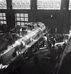 Keywords: locomotive maintenance engine steam repair black and white retro transportation railway railroad shop industrial workers labor industry