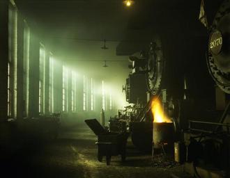 Keywords: locomotive roundhouse chicago 1943 building transportation train locomotives travel workshop industry fire sunlight industrial interior architecture