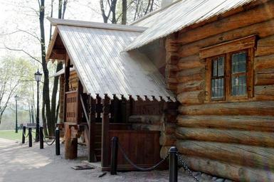 Keywords: log cabin wood cabin hut brown historic tzar's dwelling slanted roof simplistic green grass trees spring sky sunshine