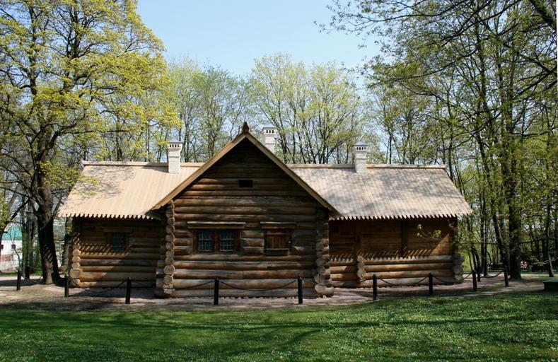 Keywords: log cabin wood cabin hut brown historic tzar's dwelling slanted roof simplistic green grass trees spring sky sunshine