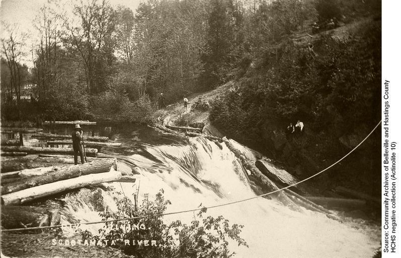 Keywords: logging log drive logdrive actinolite billa flint billaflint skootamatta river logger pike pole pikepole moira river moirariver skootamatta river skootamattariver troy logs spring thaw springthaw belleville monochrome outdoor This photo and information contributed by the Community Archives of Belleville and Hastings County show a log driver with his pike pole being watched by three young boys from what appears to be a logging trail with six others seated on the ground nearby. Logging has been an important industry in Hastings County from its early settlement to the 21st century. Before mechanized equipment came into use, logs were felled in the winter and hauled to the riverbank to await the spring thaw. The logs were driven down the river to the sawmill when the water level was high after the spring melt. The Skootamatta River carried logs to Billa Flint's water powered sawmill at Actinolite (then named Troy), or further on to the Moira River for the longer journey down to the large mills in Belleville. Unknown date and exact location. This photo and information contributed by the Community Archives of Belleville and Hastings County show a log driver with his pike pole being watched by three young boys from what appears to be a logging trail with six others seated on the ground nearby. Logging has been an important industry in Hastings County from its early settlement to the 21st century. Before mechanized equipment came into use, logs were felled in the winter and hauled to the riverbank to await the spring thaw. The logs were driven down the river to the sawmill when the water level was high after the spring melt. The Skootamatta River carried logs to Billa Flint's water powered sawmill at Actinolite (then named Troy), or further on to the Moira River for the longer journey down to the large mills in Belleville. Unknown date and exact location. |
