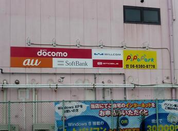 Keywords: Logos of cellular phone company.JPG ja 携帯電話会社のロゴを撮影 2014-08-04 12 09 41 own Tokumeigakarinoaoshima cc-zero Uploaded with UploadWizard NTT DoCoMo advertisements KDDI SoftBank Mobile advertisements Willcom EAccess Logos of companies