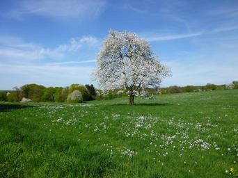 Keywords: lonely tree meadow spring landscape white blossom