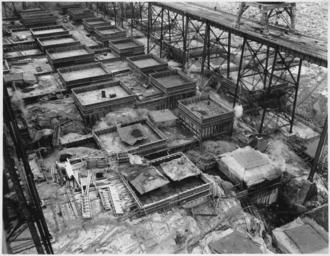| Keywords: Looking down on blocks of concrete poured in the central portion of the dam and west side power house area - NARA - 294234.jpg Scope and content Photograph from Volume Two of a series of photo albums documenting the construction of the Grand Coulee Dam and related work on the Columbia Basin Project General notes 294234 Local identifier Department of the Interior Bureau of Reclamation Engineering and Research Center 05/18/1981 - 03/04/1988 NARA's Rocky Mountain Region Denver NRGA Building 48 Denver Federal Center West 6th Avenue and Kipling Street Denver CO 80225-0307 1936-02-03 Record group Record Group 115 Records of the Bureau of Reclamation 1889 - 2008 Record group ARC 444 Photograph albums compiled 1903 - 1972 Series ARC 293611 File unit File unit ARC Variant control numbers NAIL Control Number NRG-115-CONSTPHO85006-COLBASIN2964 Other versions <gallery> File Looking down on blocks of concrete poured in the central portion of the dam and west side power house area - NARA - 294234 tiff tif File Looking down on blocks of concrete poured in the central portion of the dam and west side power house area - NARA - 294234 jpg jpg </gallery> NARA-cooperation PD-USGov Construction of the Grand Coulee Dam |