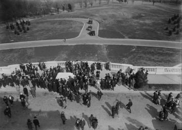 | Keywords: Looking E from atop Memorial Amphitheater at Tomb of the Unknown Soldier - Arlington National Cemetery - Arlington County VA USA - between 1921 and 1923.jpg en Standing atop the entrance hall of the Memorial Amphitheater in Arlington National Cemetery looking east and down at the new Tomb of the Unknown Soldier In Arlington County Virginia in the United States Image taken between 1921 and 1923 The image depicts the original tomb or cenotaph which was nothing more than a low marble slab over the shaft which led down approximately 40 feet into the earth below where the coffin lay Guarding of the tomb would not occur until 1937 The amphitheater's original balustrade and the retaining wall below it are clearly visible; the monumental stairs leading down to the overlook below would not be constructed until the tomb block itself was set in place in 1931 Note the original landscape to the east of the amphitheater grounds It contains roadways little landscaping and it slopes north There is no overlook to the east This area would be significantly regarded the roads removed a formal Italiante garden planted and a new concrete and granite overlook with pylons and fountain placed on the far eastern end in 1931 http //www loc gov/pictures/item/hec2013002172/ Harris Ewing 1921 1923 Tomb of the Unknowns in 1921 PD-USGov |