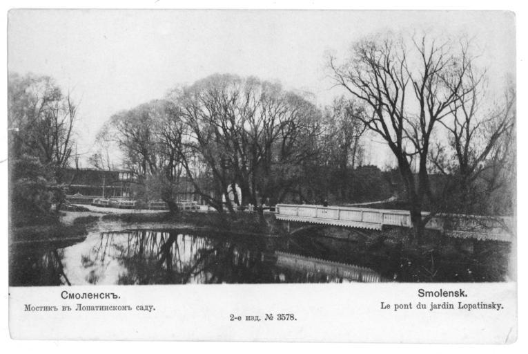 | Keywords: Lopatinskiy garden 10.jpg  en View of the pond and the bridge now rebuilt in Lopatinskii garden ru Вид на п уд и мостик ныне пе ест оен в Лопатинском саду О игинальная отк ытка  е установлены before 1917 года PD-RusEmpire 20th-century postcards Postcards of Smolensk |