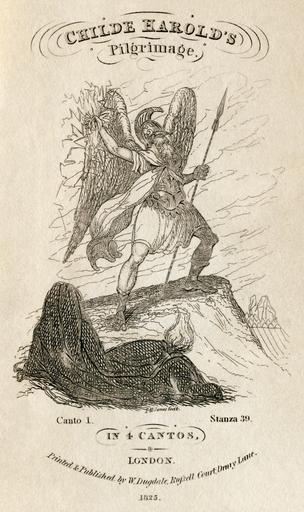 | Keywords: Lord Byron - Childe Harold's Pilgimage - Dugdale edition.jpg Assessments 1 Childe Harold's Pilgrimage Frontispiece to the 1825/1826 see below edition of Childe Harold's Pilgrimage by Lord Byron published by W Dugdale Russell Court Drury Lane The engraving is by I H Jones The text depicted is Canto I Stanza 39 which reads Lo where the Giant on the mountain stands His blood-red tresses deep'ning in the sun With death-shot glowing in his fiery hands And eye that scorcheth all it glares upon; Restless it rolls now fixed and now anon Flashing a far ”and at his iron feet Destruction cowers to mark what deeds are done For on this morn three potent nations meet To shed before his shrine the blood he deems most sweet Frontispice de l'édition de 1825/26 de Childe Harold's Pilgrimage Trad « Le pèlerinage de Childe Harold » par Lord Byron publié par W Dugdale La gravure est de I H Jones Childe Harold's Pilgrimage by Lord Byron published by W Dugdale Russell Court Drury Lane London 1825/1826 Title page gives 1826 frontispiece 1825 I H Jones PD-Old Image Lord Byron - Childe_Harold's Pilgimage_-_Dugdale_edition png - Archival PNG Image Lord Byron - Childe_Harold's Pilgimage_-_Dugdale_edition - original scan png - original scan Minor cleanup and levels adjustment to try and match original paper tone Childe Harold's Pilgrimage Childe Harold's Pilgrimage 00 19 24 April 2009 UTC Lord Byron - Childe Harold's Pilgimage - Dugdale edition jpg |