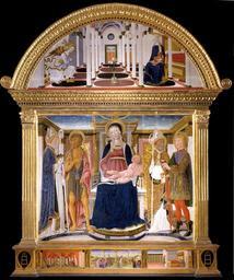 | Keywords: Lorenzo di Pietro known as "Vecchietta" - "Pala di Spedaletto". Madonna with Child and Saints Biagio, John the Baptist, Nicola and Floriano; A... - Google Art Project.jpg 1410 Siena 1410 1480 Siena 1480 Lorenzo male 27795326 di Pietro known as Vecchietta Italian 1410 - 1480 /collection/fondazione-musei-senesi/artwork/pala-di-spedaletto-madonna-with-child-and-saints-biagio-john-the-baptist-nicola-and-floriano-annunciation-lorenzo-di-pietro-known-as-vecchietta/27808357/ Pala di Spedaletto Madonna col Bambino e i Santi Biagio Giovanni Battista Nicola e Floriano Lorenzo di Pietro known as Vecchietta painter sculptor architect goldsmith /artist/lorenzo-di-pietro-known-as-vecchietta/28936204/ 28936204 /collection/fondazione-musei-senesi/ Fondazione Musei Senesi 27793395 http //www museisenesi org/ /collection/fondazione-musei-senesi/artwork/pala-di-spedaletto-madonna-with-child-and-saints-biagio-john-the-baptist-nicola-and-floriano-annunciation-lorenzo-di-pietro-known-as-vecchietta/27808357/ 1462 1462 360 27808357 False 1462 1462 /collection/fondazione-musei-senesi/level/pienza/27947180/ Pienza 28 http //english museisenesi org/media/museo-diocesano Fondazione Musei Senesi Fondazione Musei Senesi Comune di Pienza; Diocesi di Montepulciano Chiusi Pienza; Fondazione Musei Senesi tempera on panel 1460 1470 Pienza Diocesan Museum Province of Siena collocation w270 x h360 cm 1462 False 0 8359375 Fondazione Musei Senesi Object /collection/fondazione-musei-senesi/level/pienza/27947180/diocesan-museum/27939250/ Diocesan Museum pala-di-spedaletto-madonna-with-child-and-saints-biagio-john-the-baptist-nicola-and-floriano-annunciation-lorenzo-di-pietro-known-as-vecchietta Pala di Spedaletto Madonna with Child and Saints Biagio John the Baptist Nicola and Floriano; Annunciation zzz 270 special url_id 1QHEqLy63W1uTA PD-old-100-1923 1480 Google Art Project works by Vecchietta Vecchietta |