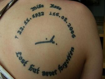Keywords: Lost but never forgotten.JPG en A tatoo to remember the artist Mike Rose Own Heriz 2006 Mike Rose Tattoos in English Name tattoos Memorial tattoos Monuments and memorials to artists