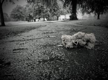 Keywords: lost teddy bear toy sadness pet symbol rain loneliness lonely background black white