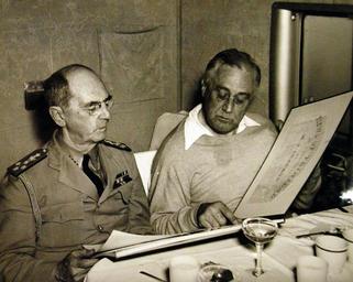 | Keywords: people indoor Lot 11569-2: President Franklin D. Roosevelt and Admiral William D. Leahy, USN, look over a scenic book on Trinidad aboard a plane flying the President and his party to the United States from Casablanca, January 1943. The President points out a place of interest to his chief military adviser, Admiral Leahy. The book was a present to the President during a stopover at Trinidad. Office of War Information Photograph. Also at LOC as LC-USZ62-122776 (2016/02/19). Lot 11569-2: President Franklin D. Roosevelt and Admiral William D. Leahy, USN, look over a scenic book on Trinidad aboard a plane flying the President and his party to the United States from Casablanca, January 1943. The President points out a place of interest to his chief military adviser, Admiral Leahy. The book was a present to the President during a stopover at Trinidad. Office of War Information Photograph. Also at LOC as LC-USZ62-122776 (2016/02/19). |