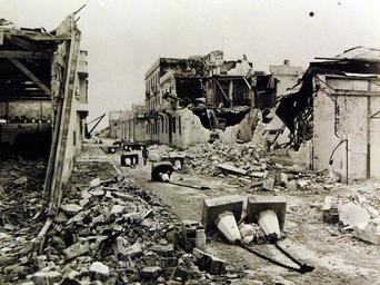 | Keywords: outdoor Lot-11579-14: North African Campaign, Battle of Tunisia, November 1942 to May 1943. Sousse, Tunisia, 1943. A building which received a direct hit in a raid over the town by bombers of the Northwest African Strategic Air Forces before the German and Italians retreated. The enemy had placed tank obstructions in the street. Photographed 1943. U.S. Army Air Forces Photograph. Courtesy of the Library of Congress. (2016/06/10). Lot-11579-14: North African Campaign, Battle of Tunisia, November 1942 to May 1943. Sousse, Tunisia, 1943. A building which received a direct hit in a raid over the town by bombers of the Northwest African Strategic Air Forces before the German and Italians retreated. The enemy had placed tank obstructions in the street. Photographed 1943. U.S. Army Air Forces Photograph. Courtesy of the Library of Congress. (2016/06/10). |