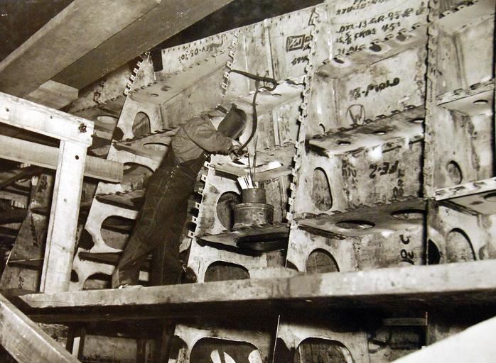 | Keywords: architecture Lot-2068-5: Norfolk Naval Shipyard, Norfolk, Virginia. One of the major advances in shipbuilding during the last few years has been the substitution of welding for rivets in a number of vital parts of Warcraft. Welding means much less weight and much less steel for each ship. This welder, working on the nose section of a new destroyer, is one of hundreds working on vessels under construction at Norfolk. Office of War Information photograph, circa October 1941. Courtesy of the Library of Congress. (2016/04/14). Lot-2068-5: Norfolk Naval Shipyard, Norfolk, Virginia. One of the major advances in shipbuilding during the last few years has been the substitution of welding for rivets in a number of vital parts of Warcraft. Welding means much less weight and much less steel for each ship. This welder, working on the nose section of a new destroyer, is one of hundreds working on vessels under construction at Norfolk. Office of War Information photograph, circa October 1941. Courtesy of the Library of Congress. (2016/04/14). |