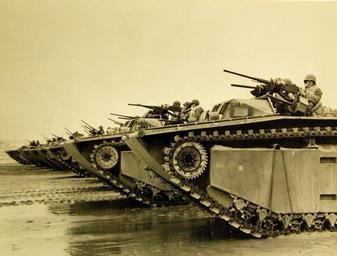 | Keywords: vehicle outdoor monochrome Lot 2290-1: Landing Vehicle Tracked (LVT), amphibious warfare vehicle. Shown are a row of the “Water Buffalos,” designed, engineered and built by Food Machinery Corporation Division at Lakeland, Florida; Los Angeles, San Jose, and Riverside, California. Photograph donated by Food Machinery in June 1945. (8/28/2015). Lot 2290-1: Landing Vehicle Tracked (LVT), amphibious warfare vehicle. Shown are a row of the “Water Buffalos,” designed, engineered and built by Food Machinery Corporation Division at Lakeland, Florida; Los Angeles, San Jose, and Riverside, California. Photograph donated by Food Machinery in June 1945. (8/28/2015). |