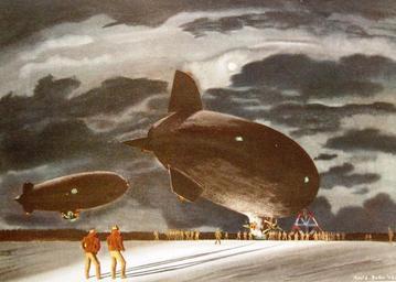 Keywords: outdoor Lot 3124-8: Paintings of Naval Aviation during World War II: Abbott Collection. #66: “By the Light of the Moon” Artwork by Adolf Dehn. “A U.S. Navy airship rests immobile at its mooring mast, engines idle, as its crew walks forward in a floodlight’s illumination. Engines soon will turn over, and it will be released to take to moonlit skies on a night mission. Meanwhile, the ground crew, hands in pockets against the sharp night air, idle alertly in position until they are called to the handling lines.” (7/10/2015). Lot 3124-8: Paintings of Naval Aviation during World War II: Abbott Collection. #66: “By the Light of the Moon” Artwork by Adolf Dehn. “A U.S. Navy airship rests immobile at its mooring mast, engines idle, as its crew walks forward in a floodlight’s illumination. Engines soon will turn over, and it will be released to take to moonlit skies on a night mission. Meanwhile, the ground crew, hands in pockets against the sharp night air, idle alertly in position until they are called to the handling lines.” (7/10/2015).