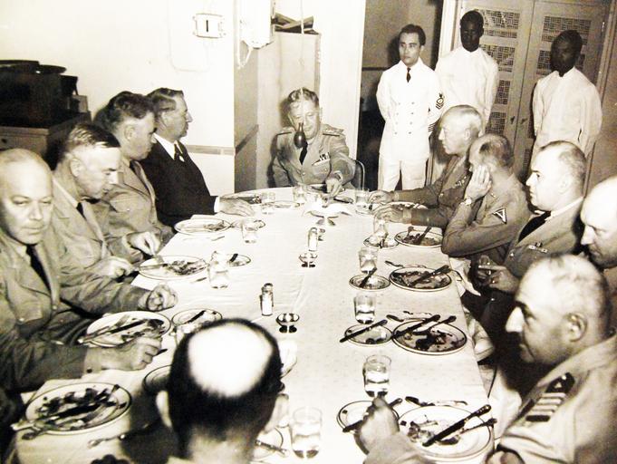 Keywords: Lot-4263-16: Secretary of the Navy Frank Knox, (left),Vice Admiral H.K. Hewitt, (center), and Lieutenant General George S. Patton, (right), with respective staffs having dinner on board USS Ancon (AGC 4) Photograph comes from an album focusing on SECNAV Knox journey to Europe in September and October 1943. Secretary of the Navy Frank Knox Collection. Photographed through Mylar sleeve. (2015/11/20). Lot-4263-16: Secretary of the Navy Frank Knox, (left),Vice Admiral H.K. Hewitt, (center), and Lieutenant General George S. Patton, (right), with respective staffs having dinner on board USS Ancon (AGC 4) Photograph comes from an album focusing on SECNAV Knox journey to Europe in September and October 1943. Secretary of the Navy Frank Knox Collection. Photographed through Mylar sleeve. (2015/11/20). |