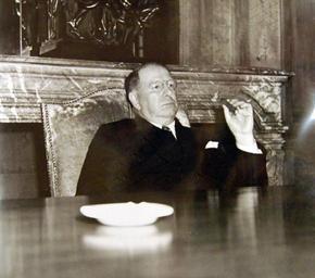 | Keywords: people Lot-4263-3: Secretary of the Navy Frank Knox during a serious discussion in his London Press Conference. Knox was the 46th Secretary of the Navy. Photograph comes from an album focusing on SECNAV Knox journey to Europe in September and October 1943. Secretary of the Navy Frank Knox Collection. Photographed through Mylar sleeve. (2015/11/20). Lot-4263-3: Secretary of the Navy Frank Knox during a serious discussion in his London Press Conference. Knox was the 46th Secretary of the Navy. Photograph comes from an album focusing on SECNAV Knox journey to Europe in September and October 1943. Secretary of the Navy Frank Knox Collection. Photographed through Mylar sleeve. (2015/11/20). |
