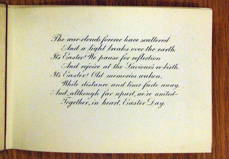 | Keywords: document text writing photo border Lot-7607-4a: WWI Greeting Cards. Card reads, “The war clouds forever have scattered / And a light breaks over the earth. / It’s Easter! We pause for reflection / And rejoice at the Saviour’s re-birth. It’s Easter! Old memories waken / While distance and time fade away / And although far apart, we’re united / Together, in heart, Easter Day.” Courtesy of the Library of Congress. (2016/09/02). Lot-7607-4a: WWI Greeting Cards. Card reads, “The war clouds forever have scattered / And a light breaks over the earth. / It’s Easter! We pause for reflection / And rejoice at the Saviour’s re-birth. It’s Easter! Old memories waken / While distance and time fade away / And although far apart, we’re united / Together, in heart, Easter Day.” Courtesy of the Library of Congress. (2016/09/02). |