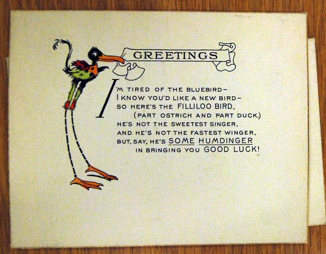 | Keywords: text writing document photo border Lot-7607-6:   WWI Greeting Cards.  Card reads, “Greetings.  I’m tired of the bluebird – I know you’d like a new bird – so here’s the Filliloo Bird (part ostrich and part duck) – He’s not the sweetest singer – and he’s not the fastest winger – But, say, he’s some humdinger – in bringing you good luck!”  Courtesy of the Library of Congress.  (2016/09/02). Lot-7607-6:   WWI Greeting Cards.  Card reads, “Greetings.  I’m tired of the bluebird – I know you’d like a new bird – so here’s the Filliloo Bird (part ostrich and part duck) – He’s not the sweetest singer – and he’s not the fastest winger – But, say, he’s some humdinger – in bringing you good luck!”  Courtesy of the Library of Congress.  (2016/09/02). |