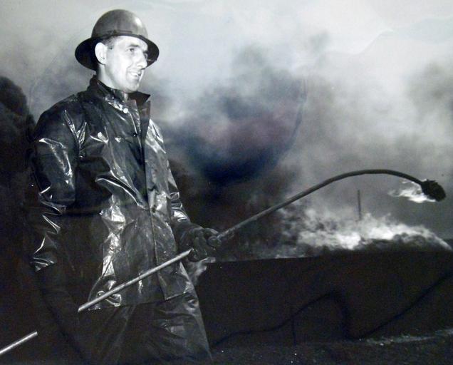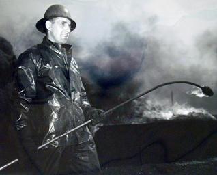 | Keywords: Lot-840-11: “Firemen of the Fleet,” August 15, 1943. In peace or war, there is one foe eternally feared by every man that goes to sea – fire. In wartime, fire is twice as deadly in peace. Ignited by enemy shells or bombs, the flames menace personnel already busy at their battle stations – and every man called from his post gives the foe that much more advantage during action. Thus the Navy has founded fire-fighting schools to train specialists in the grim art of extinguishing fires anywhere aboard ship quickly and methodically. Different methods are taught the seagoing fireman for combatting flames in different sections of the ship. To lend realism to the courses, substantial “mock-ups” of vessels have been built, in which the trainees learn their grim lessons, mater the use of their flame-fighting equipment. Shown: Turnabout – For many years an expert in putting out fires, this professional fireman now lights them as part of his duty as instructor in the fire-fighting school. Under his knowing eye, students at the school learn all the “tricks of the trade.” U.S. Navy Photograph. Courtesy of the Library of Congress. (2016/04/14). Photographed through Mylar sleeve. Lot-840-11: “Firemen of the Fleet,” August 15, 1943. In peace or war, there is one foe eternally feared by every man that goes to sea – fire. In wartime, fire is twice as deadly in peace. Ignited by enemy shells or bombs, the flames menace personnel already busy at their battle stations – and every man called from his post gives the foe that much more advantage during action. Thus the Navy has founded fire-fighting schools to train specialists in the grim art of extinguishing fires anywhere aboard ship quickly and methodically. Different methods are taught the seagoing fireman for combatting flames in different sections of the ship. To lend realism to the courses, substantial “mock-ups” of vessels have been built, in which the trainees learn their grim lessons, mater the use of their flame-fighting equipment. Shown: Turnabout – For many years an expert in putting out fires, this professional fireman now lights them as part of his duty as instructor in the fire-fighting school. Under his knowing eye, students at the school learn all the “tricks of the trade.” U.S. Navy Photograph. Courtesy of the Library of Congress. (2016/04/14). Photographed through Mylar sleeve. |