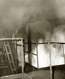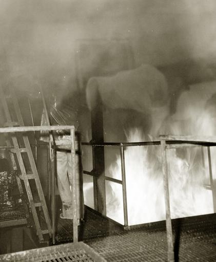 | Keywords: monochrome surreal Lot-840-6: “Firemen of the Fleet,” August 15, 1943. In peace or war, there is one foe eternally feared by every man that goes to sea – fire. In wartime, fire is twice as deadly in peace. Ignited by enemy shells or bombs, the flames menace personnel already busy at their battle stations – and every man called from his post gives the foe that much more advantage during action. Thus the Navy has founded fire-fighting schools to train specialists in the grim art of extinguishing fires anywhere aboard ship quickly and methodically. Different methods are taught the seagoing fireman for combatting flames in different sections of the ship. To lend realism to the courses, substantial “mock-ups” of vessels have been built, in which the trainees learn their grim lessons, mater the use of their flame-fighting equipment. Shown: Member of firefighting school is almost veiled from the camera by the blanket of smoke arising from the roaring blaze ignited for training purposes below deck of the “vessel.” U.S. Navy Photograph. Courtesy of the Library of Congress. (2016/04/14). Photographed through Mylar sleeve. Lot-840-6: “Firemen of the Fleet,” August 15, 1943. In peace or war, there is one foe eternally feared by every man that goes to sea – fire. In wartime, fire is twice as deadly in peace. Ignited by enemy shells or bombs, the flames menace personnel already busy at their battle stations – and every man called from his post gives the foe that much more advantage during action. Thus the Navy has founded fire-fighting schools to train specialists in the grim art of extinguishing fires anywhere aboard ship quickly and methodically. Different methods are taught the seagoing fireman for combatting flames in different sections of the ship. To lend realism to the courses, substantial “mock-ups” of vessels have been built, in which the trainees learn their grim lessons, mater the use of their flame-fighting equipment. Shown: Member of firefighting school is almost veiled from the camera by the blanket of smoke arising from the roaring blaze ignited for training purposes below deck of the “vessel.” U.S. Navy Photograph. Courtesy of the Library of Congress. (2016/04/14). Photographed through Mylar sleeve. |