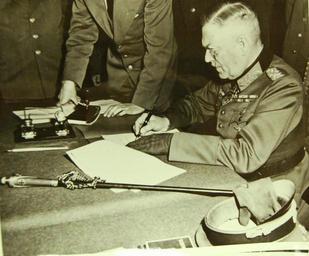 | Keywords: indoor Lot 8988-15 (SC-111-27429): Surrender of Germany, May 7, 1945. Field Marshall Wilheim Keitel, signing the ratified surrender terms for the Germany Army at Russian Headquarters in Berlin. U.S. Army photograph. (2015/10/16). Lot 8988-15 (SC-111-27429): Surrender of Germany, May 7, 1945. Field Marshall Wilheim Keitel, signing the ratified surrender terms for the Germany Army at Russian Headquarters in Berlin. U.S. Army photograph. (2015/10/16). | ||||