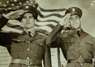 | Keywords: groupshot people Lot-9427-12: They Fight Again. The heavy-weight boxers Billy Conn, (left), and Joe Louis, (right), fought last year’s most outstanding battle in the American prize ring. Now Privates in the U.S. Army, they are fighting again, this time against a common foe. Photograph released March 1942 by Office of War Information. (2015/11/20). Lot-9427-12: They Fight Again. The heavy-weight boxers Billy Conn, (left), and Joe Louis, (right), fought last year’s most outstanding battle in the American prize ring. Now Privates in the U.S. Army, they are fighting again, this time against a common foe. Photograph released March 1942 by Office of War Information. (2015/11/20). |
