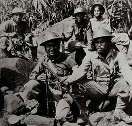 | Keywords: people outdoor Lot-9432-17: Battle of Bataan, 7 January – 9 April 1942. These Filipinos Mopped-Up a Japanese Landing Party. This handful of Filipino Scouts had just mopped up a Japanese landing party when the picture was made on the Philippines’ Bataan Peninsula. One of the Scouts holds a Samurai sword, which was taken from Japanese officer who was slain in the fight. Courageous men like these were an important factor in enabling the American and Filipino forces to hold Bataan, in the face of tremendous odds, for more than three months – long after it had been written off by outside military experts. Office of War Information Photograph, 9-15 April 1942. Original photograph is small. (2015/12/18). Lot-9432-17: Battle of Bataan, 7 January – 9 April 1942. These Filipinos Mopped-Up a Japanese Landing Party. This handful of Filipino Scouts had just mopped up a Japanese landing party when the picture was made on the Philippines’ Bataan Peninsula. One of the Scouts holds a Samurai sword, which was taken from Japanese officer who was slain in the fight. Courageous men like these were an important factor in enabling the American and Filipino forces to hold Bataan, in the face of tremendous odds, for more than three months – long after it had been written off by outside military experts. Office of War Information Photograph, 9-15 April 1942. Original photograph is small. (2015/12/18). |