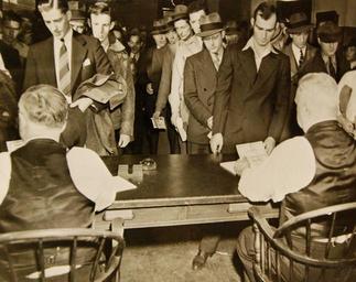 | Keywords: indoor monochrome Lot-9433-5: These Are The Ships And The Men Who Deliver Oil To The Allies. Despite Axis submarines, the U.S. is continuing to deliver oil for the Allied war machine. This success is due chiefly to two things – tankers and men. The tankers carry their own “cargo insurance” – big guns for the U-boats, machine guns for enemy aircraft. The men who man them are tough, fearless and capable of meeting any opposition the enemy has to offer. These pictures, made aboard a U.S. tanker, show the men at work and some of the measures taken to protect them. Shown: Enemy submarines hold no terror for these Americans, lined up to apply for a job on a tanker. Office of War Information Photograph, 16-22 April 1942. Original photograph is small. (2015/12/18). Lot-9433-5: These Are The Ships And The Men Who Deliver Oil To The Allies. Despite Axis submarines, the U.S. is continuing to deliver oil for the Allied war machine. This success is due chiefly to two things – tankers and men. The tankers carry their own “cargo insurance” – big guns for the U-boats, machine guns for enemy aircraft. The men who man them are tough, fearless and capable of meeting any opposition the enemy has to offer. These pictures, made aboard a U.S. tanker, show the men at work and some of the measures taken to protect them. Shown: Enemy submarines hold no terror for these Americans, lined up to apply for a job on a tanker. Office of War Information Photograph, 16-22 April 1942. Original photograph is small. (2015/12/18). |