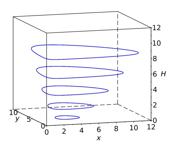 Keywords: Lotka–Volterra equations, conserved quantity 3D plot.svg ja 捕食 -被食 系のロトカ・ヴォルテラ方程式の軌道 x y と 存量 H の関係の図示例 ロトカ・ヴォルテラ方程式は <math>\frac dx dt a x - b xy</math> <math>\frac dy dt c xy - d y</math> で与えられ 存量 H は <math>H cx + by - d \log x - a \log y</math> で与えられる 図では パラメータは a 5 b 2 c 2 d 6 を代入 状態 x<sub>0</sub> y<sub>0</sub> は 下から順に 4 3 5 5 4 5 6 5 5 7 6 5 8 7 5 2016-03-02 own Yapparina other versions Scilab source <source lang scilab > clear; a 5; b 2; c 2; d 6; function dx LV t x dx 1 a x 1 -b x 1 x 2 ; dx 2 c x 1 x 2 -d x 2 ; endfunction T linspace 0 10 1000 ; x0 d/c y0 a/b X0 x0; y0; clf; for i 1 6 do X ode X0 0 T LV ; H c X 1 +b X 2 -d log X 1 -a log X 2 ; param3d X 1 X 2 H 'r' e gce ; e foreground color 'blue' ; X0 X0+1; 1; end xlabel 'x' ; ylabel 'y' ; zlabel 'H' ; gh gca ; gh font_style 6; gh font_size 6; gh x_label font_style 7; gh x_label font_size 6; gh y_label font_style 7; gh y_label font_size 6; gh z_label font_style 7; gh z_label font_size 6; gh data_bounds 0 0 0; 12 12 12; </source> cc-zero Lotka-Volterra equations |