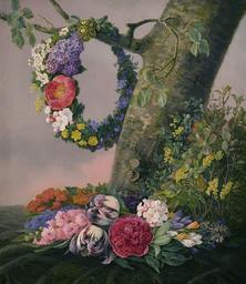 | Keywords: Løvmand En buket blomster ved foden af et træ 1832.jpg en En buket blomster ved foden af et træ På en gren hænger en blomsterkrans painting by Danish artist Christine Løvmand oil on canvas 65 5 by 57 5 Statens Museum for Kunst http //soeg smk dk/vark asp ObjectId 8704 Christine Løvmand 1832 PD-old-100 Christine Løvmand 1832 paintings Paintings of flowers Paintings in Statens Museum for Kunst | ||||