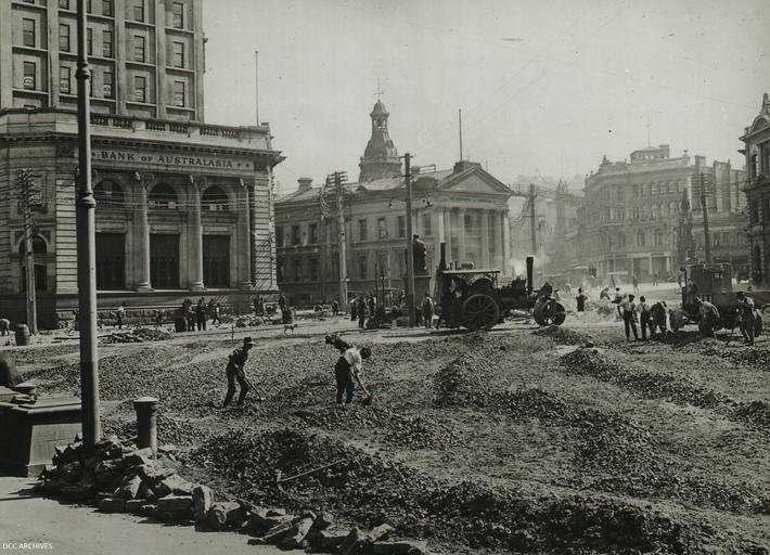 Keywords: dunedin construction road historic queens gardens queensgardens rattray street rattraystreet outdoor blackandwhite monochrome black and white DCC Archives, Photo 330/36, Street Works - Lantern Slide Collection DCC Archives, Photo 330/36, Street Works - Lantern Slide Collection