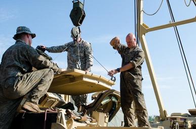 Keywords: outdoor Sgt. 1st Class Clayton Felton, a motor sergeant, and Spc. Devin Marshal, a small arms artillery repairer, with the 1-163rd Combined Arms Battalion from Montana Army National Guard and Spc. Jade Parsons, a medic with 116th Brigade Support Battalion from Idaho Army National Guard from Boise, Idaho secure an engine cover on a Bradley Fighting Vehicle at the Romanian Land Forces Combat Training Center in Cincu, Romania, July 22, 2016. Soldiers with the 1-163rd will support the 116th Cavalry Brigade Combat Team from Boise, Idaho during multi-national exercise Saber Guardian, a multinational military exercise involving approximately 2,800 military personnel from ten nations including Armenia, Azerbaijan, Bulgaria, Canada, Georgia, Moldova, Poland, Romania, Turkey, Ukraine and the U.S. The objectives of this exercise are to build multinational, regional and joint partnership capacity by enhancing military relationships, exchanging professional experiences, and improving interoperability between the land forces from the participating countries. Saber Guardian will begin July 27 and finish August 7, 2016. (U.S. Army Photo by Staff Sgt. E. James Omelina, 115th Mobile Public Affairs Detachment). Sgt. 1st Class Clayton Felton, a motor sergeant, and Spc. Devin Marshal, a small arms artillery repairer, with the 1-163rd Combined Arms Battalion from Montana Army National Guard and Spc. Jade Parsons, a medic with 116th Brigade Support Battalion from Idaho Army National Guard from Boise, Idaho secure an engine cover on a Bradley Fighting Vehicle at the Romanian Land Forces Combat Training Center in Cincu, Romania, July 22, 2016. Soldiers with the 1-163rd will support the 116th Cavalry Brigade Combat Team from Boise, Idaho during multi-national exercise Saber Guardian, a multinational military exercise involving approximately 2,800 military personnel from ten nations including Armenia, Azerbaijan, Bulgaria, Canada, Georgia, Moldova, Poland, Romania, Turkey, Ukraine and the U.S. The objectives of this exercise are to build multinational, regional and joint partnership capacity by enhancing military relationships, exchanging professional experiences, and improving interoperability between the land forces from the participating countries. Saber Guardian will begin July 27 and finish August 7, 2016. (U.S. Army Photo by Staff Sgt. E. James Omelina, 115th Mobile Public Affairs Detachment).