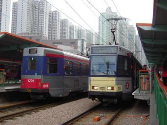 Keywords: LRT 705 706 Tin Yat.jpg en MTR LRT Train 1102 on route 705 and 1206 on route 706 at Tin Yat Stop Own LRT505 09-02-23 Phase II LRV MTR Phase III LRV MTR