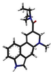 | Keywords: LSD-from-xtal-and-Spartan-PM3-3D-sticks-web.png Stick model of the lysergic acid diethylamide LSD molecule C<sub>20</sub>H<sub>25</sub>N<sub>3</sub>O Colour code Carbon C grey-black Hydrogen H white Nitrogen N blue Oxygen O red Structure based on that found in the related salt LSD o-iodobenzoate monohydrate determined by X-ray crystallography in http //molpharm aspetjournals org/content/9/1/23 abstract Molecular Pharmacology 1973 9 23-32 Model manipulated in http //www crystalmaker com/ CrystalMaker 8 3 The structure of the LSD+H<sup>+</sup> cation from the above crystal structure was opened in http //www wavefun com/products/macintosh/Student/mac_student html Spartan Student 4 1 one hydrogen atom on the R<sub>3</sub>NH<sup>+</sup> group was deleted yielding the neutral LSD molecule Its structure was then refined with the PM3 semi-empirical method Image generated in http //accelrys com/products/discovery-studio/visualization/discovery-studio-visualizer html Accelrys DS Visualizer Own 2011-03-13 Ben Mills Benjah-bmm27 Images by Ben Mills Lysergic acid diethylamide |