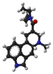 | Keywords: LSD-from-xtal-and-Spartan-PM3-3D-balls-web.png Ball-and-stick model of the lysergic acid diethylamide LSD molecule C<sub>20</sub>H<sub>25</sub>N<sub>3</sub>O Colour code Carbon C grey-black Hydrogen H white Nitrogen N blue Oxygen O red Structure based on that found in the related salt LSD o-iodobenzoate monohydrate determined by X-ray crystallography in http //molpharm aspetjournals org/content/9/1/23 abstract Molecular Pharmacology 1973 9 23-32 Model manipulated in http //www crystalmaker com/ CrystalMaker 8 3 The structure of the LSD+H<sup>+</sup> cation from the above crystal structure was opened in http //www wavefun com/products/macintosh/Student/mac_student html Spartan Student 4 1 one hydrogen atom on the R<sub>3</sub>NH<sup>+</sup> group was deleted yielding the neutral LSD molecule Its structure was then refined with the PM3 semi-empirical method Image generated in http //accelrys com/products/discovery-studio/visualization/discovery-studio-visualizer html Accelrys DS Visualizer Own 2011-03-13 Ben Mills Benjah-bmm27 Images by Ben Mills Lysergic acid diethylamide |